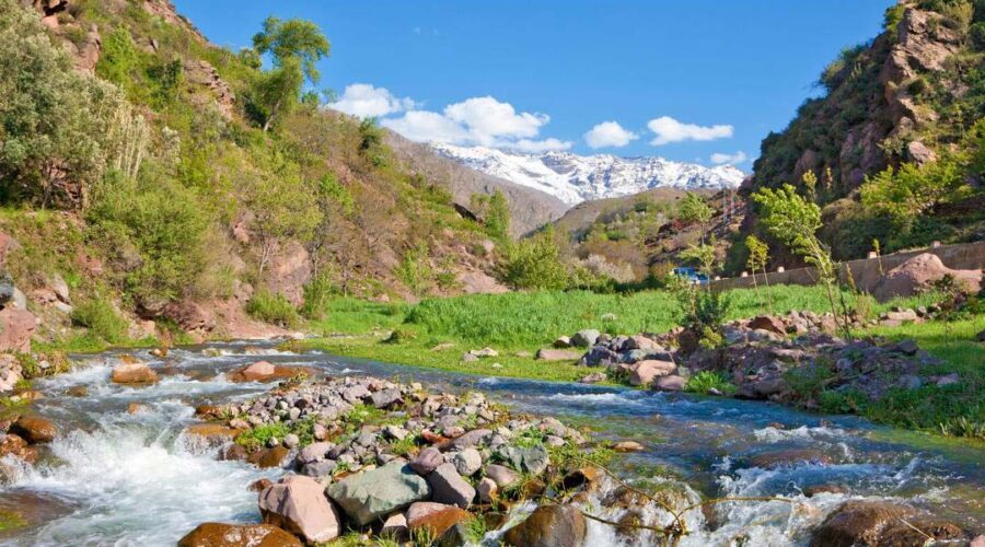 After a traditional Moroccan breakfast, embark on a guided walking tour of Marrakech. Visit the majestic Bahia Palace and wander through the rose-colored alleys of the Medina. Sample local delicacies and explore the bustling souks. In the afternoon, drive towards the Atlas Mountains, enjoying the changing landscape and arriving in Ouirgane for an overnight stay in the mountains.